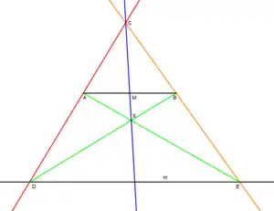 - This parallel also intersects the black line m at E, defining one end of the line segment.