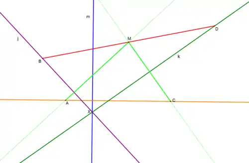 - If the lines j and k are parallel then the segment midpoint M is on the line AC - the centers of circles A(B), C(D), and M(B) are colinear - and the construction will fail. An alternative approach is required (see below).