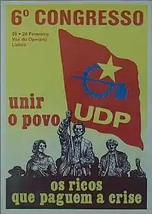 The Popular Democratic Union (Portuguese: União Democrática Popular, pronounced [uniˈɐ̃w dɨmuˈkɾatikɐ pupuˈlaɾ], or UDP) is a Marxist political movement in Portugal. The UDP transformed itself into a political association at its 15th congress due to its merger with other left-wing parties in the Left Bloc.