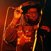 Publicity for blues parties was largely through word of mouth or over pirate radio stations and generally did not include precise details of addresses or locations, so sound systems attracted loyal but highly localised followings.[127] Sounds would also often "play out" in neighbouring areas or challenge other sound systems in a competitive sound clash, allowing the more prominent outfits to attract wider attention – during the 1970s and 1980s the better-known Handsworth sounds would attract visitors from as far afield as London, Manchester and Bristol.[128] Notable Birmingham sound systems whose reputations extended beyond the city included Quaker City, which was founded in 1965;[129] Duke Alloy, which was founded in 1966 and featured the toaster Astro who later became part of UB40;[130] and Wassifa, which featured Macka B, the most influential British toaster of the 1980s.[131] The founders of the reggae band Eclipse, who met at a blues party, later recalled "Blues would took place everywhere. You only had to go out in Lozells or down the Soho Rd, there was loads going on, you could stand and listen to the music coming out of the houses, pubs and clubs."[123]