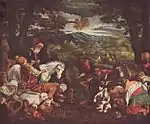 The Israelites continue their journey into the desert, and once in the Wilderness of Sin, they complain about the lack of food. Listening to their complaint, God sends them a shower of quail, and subsequently provides a daily shower of manna from heaven.