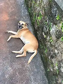 The potcake dog is a mixed-breed dog type found on several Caribbean islands. Its name comes from a traditional local dish of seasoned rice and pigeon peas; overcooked rice that sticks to the bottom of the cooking pot (forming the 'pot cake') is commonly mixed with other leftovers and fed to the dogs.[1] Although appearance varies, potcakes generally have smooth coats, cocked ears, and long faces.[2]