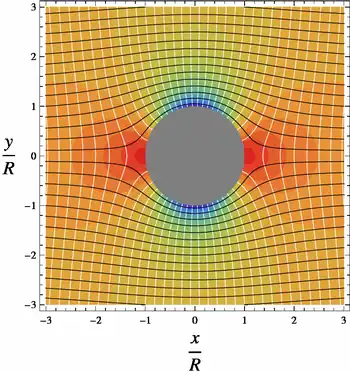 A cylinder (or disk) of radius R is placed in a two-dimensional, incompressible, inviscid flow. The goal is to find the steady velocity vector V and pressure p in a plane, subject to the condition that far from the cylinder the velocity vector (relative to unit vectors i and j) is:[1]