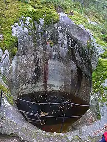 In Earth science, a pothole is a smooth, bowl-shaped or cylindrical hollow, generally deeper than wide, found carved into the rocky bed of a watercourse. Other names used for riverine potholes are pot, (stream) kettle, giant's kettle, evorsion, hollow, rock mill, churn hole, eddy mill, and kolk.[1] Although somewhat related to a pothole in origin, a plunge pool (or plunge basin or waterfall lake) is the deep depression in a stream bed at the base of a waterfall. It is created by the erosional forces of turbulence generated by water falling on rocks at a waterfall's base where the water impacts.[2] Potholes are also sometimes referred to as swirlholes. This word was created to avoid confusion with an English term for a vertical or steeply inclined karstic shaft in limestone. However, given widespread usage of this term for a type of fluvial sculpted bedrock landform, pothole is preferred in usage to swirlhole.[3]