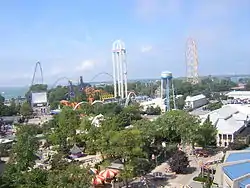 Overview of Cedar Point with Power Tower in the center, Millennium Force on the left and Top Thrill Dragster on the right.