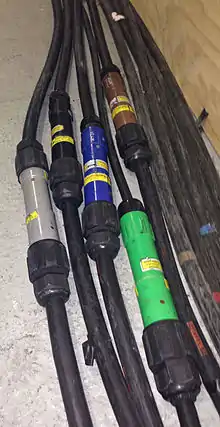 Powerlock connectors are available in 400 A and 660 A versions.[4] All versions can be used for single-phase and, much more commonly, three-phase applications. Three phase connections require five separate cables (or four if neutral is not required).
