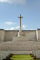 The memorial was designed by William Harrison Cowlishaw, with sculpture by Laurence A. Turner. It consists of a colonnade of wall panels forming three sides of the perimeter of a cemetery, and incorporating a Cross of Sacrifice. The names of the missing are inscribed on the panels, arranged by regiment or other unit. The fourth side of the cemetery, on the road frontage, is formed by an open arcade, with the entrance archway at its centre: the inscription is over this. The memorial was unveiled on 4 August 1930 by Sir Horace Smith-Dorrien, who had served as a general commanding the British II Corps and the British Second Army during the war.[1]