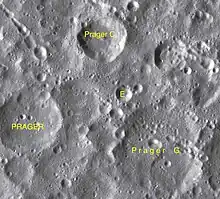 Prager is an impact crater on the Moon's far side. It is located just to the northeast of the crater Love. Farther to the south-southeast lies Lane. To the north of this crater and leading away to the northwest is a crater chain that has been designated Catena Gregory.