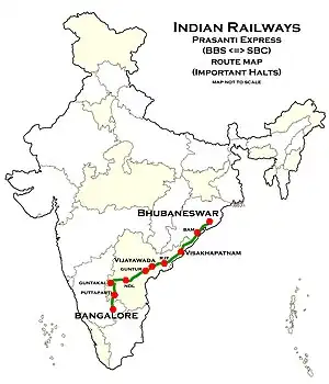 The 18463 / 18464 Prashanti Express is a daily train that runs between Bhubaneswar and Bangalore which used to run between Visakhapatnam and Bangalore previously. It leaves Bhubaneswar railway station at 05:40 a.m and reaches Bangalore City railway station the next day at 11:45 a.m. The duration of journey is approximately 30 hours. It operates as train number 18463 from Bhubaneswar to Bangalore and as train number 18464 between Bangalore and Bhubaneswar. Its previous number was 18563 and 18564.[1]