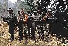 An alien spacecraft deploys a shuttle to Earth, where Vietnam War veteran Major Alan "Dutch" Schaefer[5] and his military rescue team, consisting of Mac, Poncho, Blain, Billy, and Hawkins, are tasked with rescuing a foreign cabinet minister and his aide from insurgents in an unspecified South American country. CIA officer Al Dillon, a Vietnam War buddy of Dutch's, is assigned to accompany the team over Dutch's objections. En route, the team discovers the wreckage of a helicopter and three skinned corpses. Dutch identifies them as Green Berets that he knew and becomes suspicious of Dillon's intentions. The team reaches the guerilla camp and witnesses the execution of a hostage. They mount an attack, killing most of the rebels and several Soviet intelligence officers. Dutch confronts Dillon, who reveals their true mission was to stop a planned Soviet-backed invasion and that the CIA sent the Green Berets weeks earlier for the same mission.