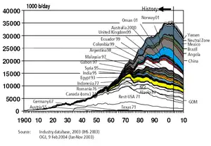The following list shows some oil-producing nations and their peak oil production years.[63]
