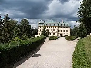 The mansion and estate where confiscated by the Communist government.[1][2] After 1948, they decided to use the mansion as a tuberculosis sanatorium, which started in 1952.[1] Rebuilding was by the architect J. Tvarozek.[2] In 1973, it was changed into an alcohol treatment centre.[1] In 1995, it also became a hospital for treatment of addiction to drugs and compulsive gambling.[1] The hospital works together with universities and hospitals in Poland, the Czech Republic, and Sweden.[1] The king was a passionate hunter and he also built a small hunting lodge in the forest around the mansion.[3] Today, it contains an exhibition on the king and can be visited.[3] One can also see the bedroom, the study and the kitchen.[3]