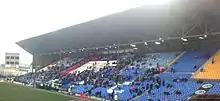 The Cowshed houses away fans at Prenton Park, and has a capacity of 2,500.[4] It has a slanted seating arrangement, caused by the main road running behind it.[13] It historically housed the more vocal home fans, but was switched to away supporters around the start of the 21st century.[13] Since the change, a bar and TV screens have been added to the stand.[13] The name is derived from its appearance before the redevelopment in 1995. With a 3 peak roof of corrugated iron, walls of wooden plank and a cinder bank floor it visually resembled an agricultural building.