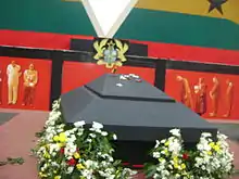 From 8–10 August, his body lay in state, and Ghanaian government officials, civil society, traditional leaders, the clergy, the general public and dignitaries such as Côte d'Ivoire's Alassane Ouattara, Liberia's Ellen Johnson Sirleaf, Nigeria's Goodluck Jonathan and Senegal's Macky Sall paid their last respects. Within this period, a two-night vigil was also held at the forecourt of the State House for cultural and musical performances such as traditional dirges, plays and tribute reading. Thousands streamed into the State House to pay their last respects to Mills as he lay in state with some mourners queuing for hours, many of them wailing with grief, in lines up to 10 km (6 miles) long per press reports.[61] The body was then taken by a military cortege from the State House parliamentary complex to the Independence Square for the funerary services which was attended by 18 African Heads of State, 5 Vice-Presidents, United States Secretary of State, Hillary Clinton, former United Nations Secretary-General, Kofi Annan, president of the Pontifical Council for Justice and Peace, Cardinal Peter Turkson, Secretary-General of African, Caribbean and Pacific Group of States, Mohamed Ibn Chambas and several other international envoys. In all, there were 67 foreign delegations represented at the funeral.[62] In addition to the over 50,000 people who gathered for the ceremony, his funeral was also attended by Benin's Thomas Boni Yayi, who said of Mills that he was "passionate about peace in Africa and in the region," as well as Togo's Faure Gnassingbe, who said "[Mills] was like a brother to me. I will surely miss him."[63]