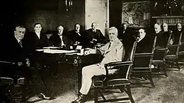 After the election, Wilson quickly chose William Jennings Bryan as Secretary of State, and Bryan offered advice on the remaining members of Wilson's cabinet.[11] William Gibbs McAdoo, a prominent Wilson supporter who married Wilson's daughter in 1914, became Secretary of the Treasury, while James Clark McReynolds, who had successfully prosecuted prominent antitrust cases, was chosen as Attorney General. On the advice of Underwood, Wilson appointed Texas Congressman Albert S. Burleson as Postmaster General.[12] Bryan resigned in 1915 due to his opposition to Wilson hard line's towards Germany in the aftermath of the sinking of the RMS Lusitania.[13] Bryan was replaced by Robert Lansing, and Wilson took more direct control of his administration's foreign policy after Bryan's departure.[14] Newton D. Baker, a progressive Democrat, became Secretary of War in 1916, and Baker led the War Department during World War I.[15] Wilson's cabinet experienced turnover after the conclusion of World War I, with Carter Glass replacing McAdoo as Secretary of the Treasury and A. Mitchell Palmer becoming Attorney General.[16]