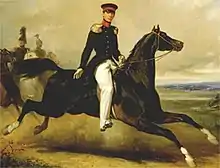 As the Prince of Orange's second son, Alexander was destined for a career in the army. On 2 August 1828, for his tenth birthday, Alexander received the rank of colonel by Royal Order. He originally started his military career in the Navy, but soon switched to the Cavalry. With his father and brother William, Alexander joined the campaign against Belgium in 1833-4.[11] Being an excellent horseman, Alexander from 1840 on served as Lieutenant-General and Inspector of the Cavalry, a position he took very seriously. Eliza Pieter Matthes, aide-de-camp to King William II, recalled a conversation he had with Alexander about the cavalry: "I had the impression he was quite knowledgeable about that weapon [the cavalry]. It is a shame he is only our Inspector-General in name, we would not be worse off if he would be so [inspector-general] effectively."[12] Prince Alexander held the positions of Lieutenant-General and Inspector-General from 1840 until his death. The Regiment Huzaren Prins Alexander is named for him.
