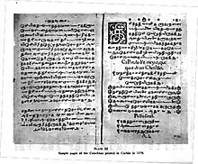 In 1577 the first of the Henriques’ five books, Doctrina Christam en Lingua Malauar Tamul (Thambiran Vanakkam) was printed in Goa. The book was the first book printed with Indian type. Although some scholars refuse to consider this as a historical fact, Graham Shaw seems convinced that it was printed. The second printed Tamil book was only 16 pages long, but a third Catechism of 127 pages, a Tamil translation of the popular Portuguese text by Marcos Jorge, was printed again with new type in Cochin on November 14, 1579. Three Catechisms were printed with three sets of type, at three different locations on the west coast over the following three years. Henriques’ two other books printed at Cochin were:
