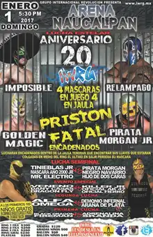 In late 1995 Adolfo Moreno decided to create his own promotion, using a regular core roster supplemented with wrestlers from Consejo Mundial de Lucha Libre (CMLL, formerly EMLL), creating the International Wrestling Revolution Group (IWRG; sometimes referred to as Grupo Internacional Revolución in Spanish) on January 1, 1996.[3] From that point on Arena Naucalpan became the main venue for IWRG, hosting the majority of their weekly shows and all of their major shows as well.[4][5] The first IWRG Anniversary Show was held on January 1, 1997 with all subsequent shows being held on or right after January 1 each year, all at Arena Naucalpan.[4] Posters for the January 1 show mistakenly lists it as the 20th anniversary show, but also bills it as a Prisión Fatal ("Deadly Prison") show.
