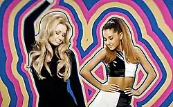 The official music video was filmed on April 29, 2014, just one day after the single's release, and was directed by The Young Astronauts who had previously worked with Grande on videos for her singles "Right There" and "Almost Is Never Enough". Kaz James makes an appearance in the video.[103] The video was inspired in Sweet Charity (1969), set with a retro style from 1960s art movement containing a black, white, and old-fashioned aesthetic.[104][105] The video opens on a sparkling figure where Grande appears in a sequined minidress and white go go boots with her dancers backed by a spiral backdrop. Iggy Azalea is shown in front of a colorful background, and, as Jason Lipzshuts from Billboard noted, her hairstyle is reminiscent of Barbarella,[106] while Chima Simone of E! compared her hair to Nancy Sinatra's in her "These Boots Are Made for Walkin'" (1966) video.[107] The video contains intercepted scenes of Grande lying atop a giant spiral on a pink floor wearing a white sweater and high socks. Lia Beck from the website Bustle compared the scene to Britney Spears's "Oops!... I Did It Again music video (2000).[108]