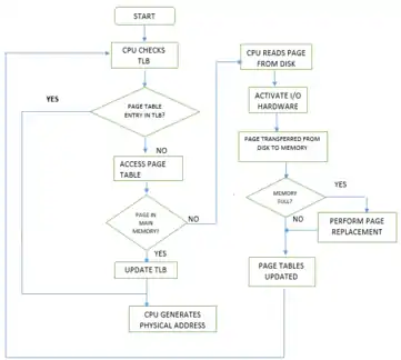 Flowchart[5] shows the working of a translation lookaside buffer. For simplicity, the page-fault routine is not mentioned.