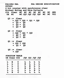 Programmable Array Logic (PAL) is a family of programmable logic device semiconductors used to implement logic functions in digital circuits introduced by Monolithic Memories, Inc. (MMI) in March 1978.[1] MMI obtained a registered trademark on the term PAL for use in "Programmable Semiconductor Logic Circuits". The trademark is currently held by Lattice Semiconductor.[2]