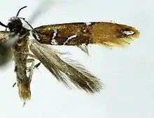 The wingspan is about 11 mm. The basal three-fifths of the forewings are ochreous brown and the distal two-fifths are ochreous yellow. The markings are silvery white or white, edged with dense black scales. The hindwings and cilia are dark grey.[1]