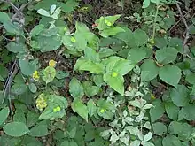 The flowers are delicate and hang down from the stem tips, each flower has four pedals. The berry is larger than a Saskatoon, pincherry or chokecherry, about the size of a grocery store cherry or small grape. The rough-fruited fairybell can be found in the same locale as other native fruits such as Saskatoons and chokecherries.[5][6][7] Berries begin yellow, then orange and when fully ripe are red, often with all three colors on the same raceme.[8] Typically 2—3 berries grow on each stem tip. The surface of the fruit feels fuzzy and velvety.[4] The berries are edible, but bland.[9]
