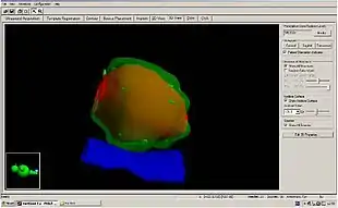 Figure 4. Computer image illustrating how the prostate (orange/red) is completely covered with radiation (green). The radiation does not affect the back passage (rectum, blue) at all.