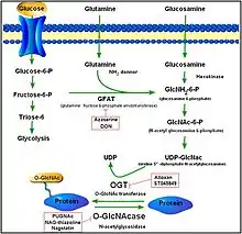 - ↑ Wells L, Gao Y, Mahoney JA, Vosseller K, Chen C, Rosen A, Hart GW (January 2002). "Dynamic O-glycosylation of nuclear and cytosolic proteins: further characterization of the nucleocytoplasmic beta-N-acetylglucosaminidase, O-GlcNAcase". The Journal of Biological Chemistry. 277 (3): 1755–61. doi:10.1074/jbc.M109656200. PMID 11788610.