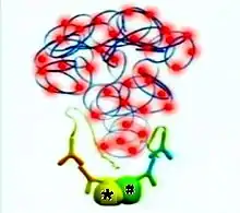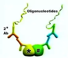 The DNA synthesis reaction results in several-hundredfold amplification of the DNA circle. Next, fluorescent-labeled complementary oligonucleotide probes are added, and they bind to the amplified DNA (Figure 4). The resulting high concentration of fluorescence is easily visible as a distinct bright spot when viewed with a fluorescence microscope.[4] In the specific case shown (Figure 5), the nucleus is enlarged because this is a B-cell lymphoma cell. The two proteins of interest are a B cell receptor and MYD88. The finding of interaction in the cytoplasm was interesting because B cell receptors are thought of as being located in the cell membrane.[5]