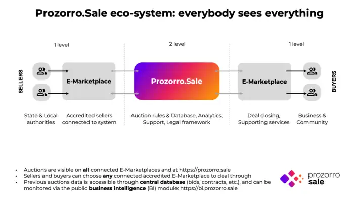 Prozorro.Sale is a two-level system. The first level — is independent electronic marketplaces (brokers), and the second — is a central database administered by Prozorro.Sale JSC, where auctions are held.