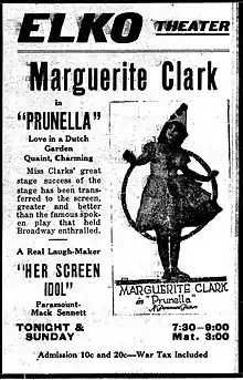 Prunella is a 1918 American silent romantic fantasy film directed by Maurice Tourneur. The film is based on the 1906 play Prunella, or, Love in a Dutch Garden by Laurence Housman and Harley Granville-Barker, and stars Marguerite Clark in the title role. Clark also starred in the 1913 Winthrop Ames produced Broadway stage production on which the film is based.[1] The majority of the film is considered lost, with only fragments still in existence.[2]