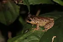 Pseudophilautus microtympanum, also known as Gunther's bubble-nest frog or small-eared shrub frog, is a species of frog in the family Rhacophoridae. It is endemic to the central hills of Sri Lanka.[2] Its natural habitat are both closed and open canopy habitats. Sub-adults and juveniles are more often found in grassland and disturbed habitats, whereas adult frogs are usually found in closed-canopy habitats. It is threatened by habitat loss, agrochemical pollution, and the desiccation of its habitat.[1]