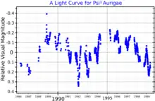 Psi1 Aurigae (ψ1 Aur, ψ1 Aurigae) is a star in the northern constellation of Auriga. It is faintly visible to the naked eye with an apparent visual magnitude of 4.91.[2] Based upon a measured annual parallax shift of 0.44 mas,[1] it is approximately 7,500 light-years (2,300 parsecs) distant from the Earth. It is receding from the Sun with a radial velocity of +4.7 km/s.[5]