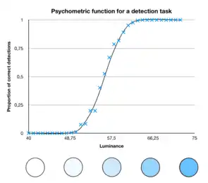 - Plot the percentage of correct responses (or a similar value) displayed on the y-axis and the physical parameter on the x-axis. If the stimulus parameter is very far towards one end of its possible range, the person will always be able to respond correctly. Towards the other end of the range, the person never perceives the stimulus properly and therefore the probability of correct responses is at chance level. In between, there is a transition range where the subject has an above-chance rate of correct responses, but does not always respond correctly. The inflection point of the sigmoid function or the point at which the function reaches the middle between the chance level and 100% is usually taken as sensory threshold.