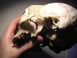 Human skull with entrance to pterygopalatine fossa marked in red