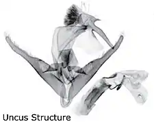 The most prominent autapomorphy is the uncus structure, which resembles the head of a long-billed bird.[7] The uncus has a large, rounded subbasal dorsal bulb bearing a small, acute frontal spine and a large group of long hairs standing apart, (in the likeness of a forelock), and a long, straight, atypically dilated rounded distal section.[7][3]