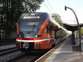 The Elron commuter trains are especially meant for the Greater Tallinn Area Harju County residents for a connection to Tallinn. Routes are also used by city residents, especially of Nõmme district, the southernmost district of Tallinn. Railway lines pass through Kristiine, Nõmme and Lasnamäe districts of the city, with the terminus stop Baltic Station being located in the Kesklinn district close to Põhja-Tallinn district. Railway transport is free for registered city residents inside the city borders (1st zone): till Vesse stop on Eastern line, Laagri stop on Western line and Männiku stop on South-Western line.[19] Trains inside of Tallinn are scheduled typically with 10-20 minute interval at rush hour (6 am - 8:30 am and 3:30 pm – 18:30 pm) and 25 - 35 minute interval at other times. Trains are in service typically from 5:15 am to 23:45, depending on the direction and line. Nõmme district has installed bicycle parking to every railway station in the district to encourage commuter train use by its residents. Currently there are no appropriate feeder bus routes for the commuter train in Nõmme district.[20]