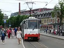 The tram network is fairly short (19.7 km or 12.2 miles) and serves mainly the city centre with its surrounding areas. There are 4 tram lines and three types of trams—Tatra KT4 (bought from the German cities of Gera, Cottbus, Frankfurt, and Erfurt) and Tatra KTNF6, which basically is a Tatra KT4 with a lowered middle-section, and CAF Urbos AXL. Twenty new CAF Urbos AXL trams entered service in 2015/16.[10] Altogether there are 65 trams in Tallinn but only about half of them are in daily use.