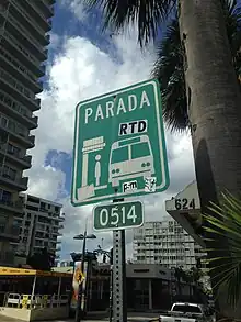 Most bus stops are identified with a "Parada" (English: stop) green sign.