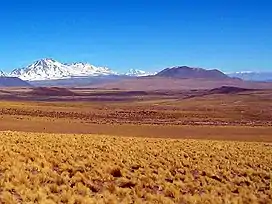 The Pajonales-Pular volcanic massif has a volume exceeding 100 cubic kilometres (24 cu mi)[6] and is formed by andesitic and dacitic rocks[7] and covers an area of 300 square kilometres (120 sq mi) on faulted Miocene sediments. The massif consists of an alignment of volcanoes and two subunits, a heavily eroded unit that consists of Pajonales and Pular proper[8] and a younger unit consisting of volcanic domes. These domes reach heights of 0.8–1 kilometre (0.50–0.62 mi) and one of these overlies a glacial moraine. Rocks of the older unit are 3.9 million years old, while one of the domes has been dated to be 1.8 million years old.[7] Unverified reports indicate an explosive eruption in 1990, but the region is remote and renewed activity is unlikely to have any impact.[9]