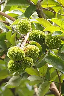 The fruit is ovoid, 5-7.5 cm long, dark red, with its thick, leathery rind closely set with conical, blunt-tipped tubercles or thick, fleshy, straight spines, which are up to 1 cm long.[2] There may be one or two small, undeveloped fruits nestled close to the stem. Within is the glistening, white or yellowish-white flesh (aril) to 1 cm thick, more or less clinging to the thin, grayish-brown seedcoat (testa) which separates from the seed. The flavor is generally much sweeter than that of the rambutan.[2] The seed is ovoid, oblong or ellipsoid, light brown, somewhat flattened on one side, and 2 to 3.5 cm long.