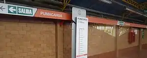 Pumacahua is a Lima Metro station on Line 1. The station is located between Parque Industrial and Villa María. It was inaugurated on 28 April 1990 as part of the first section of the line between Villa El Salvador and Atocongo. However, commercial service only started on 18 January 2003, was suspended in July 2003 due to the lack of funds, and resumed only on Saturdays and Sundays on 17 January 2004. The full revenue service started on 3 January 2012, with trains running to Miguel Grau.[1][2]