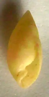 The shell is 15 mm in length and is usually white, beige, or brown, with or without black markings. It is egg shaped (ovate) with an elevated spire. The columella or central axis of the shell has a large double fold.[3]