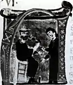 The Monge de Montaudon receives a prize for his poetry from the Puy Sainta Maria: the white sparrowhawk perched on his arm.