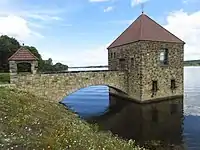 A decorative gatehouse sits at the head of the lake adjacent to the dam.