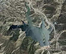 Satellite view of dam and reservoir. Interstate 5 is on the right of the image.