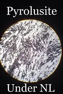 This article incorporates text from a publication now in the public domain: Chisholm, Hugh, ed. (1911). "Pyrolusite". Encyclopædia Britannica. Vol. 22 (11th ed.). Cambridge University Press. p. 693.