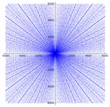 Each of these points (with their multiples) forms a radiating line in the scatter plot to the right.