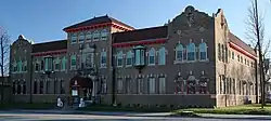 The new meeting hall on National Avenue was designed by Milwaukee architect Richard Oberst. It is a two-story brick structure on a poured concrete foundation with a roof that is flat in parts and hipped elsewhere, covered in clay tile. This much is a Mediterranean Revival style. But the structure also has pavilions on the corners with curve-topped parapets, drawn from Spanish Colonial Revival style.[3]
